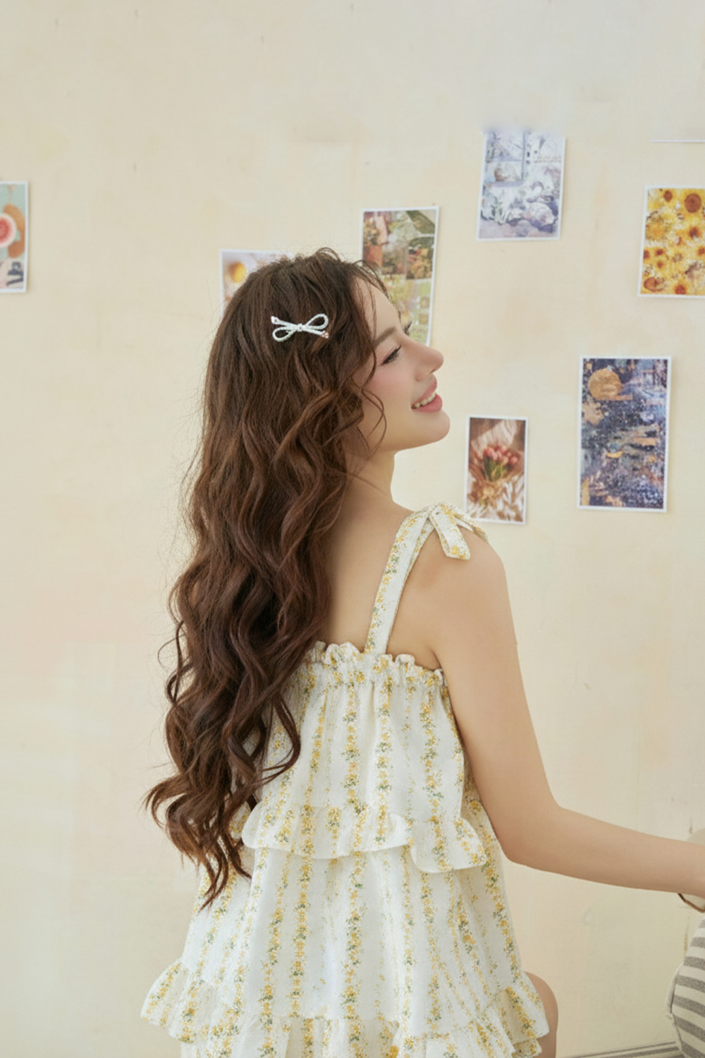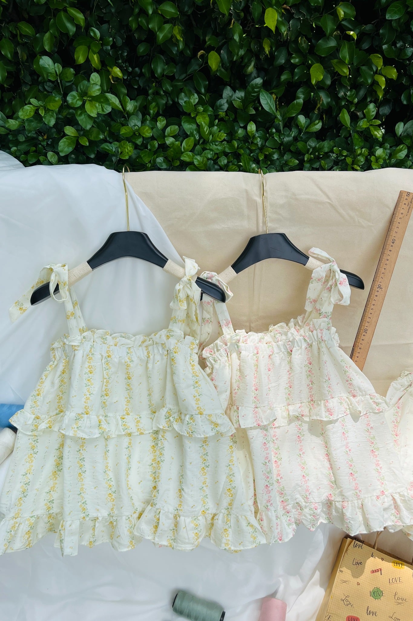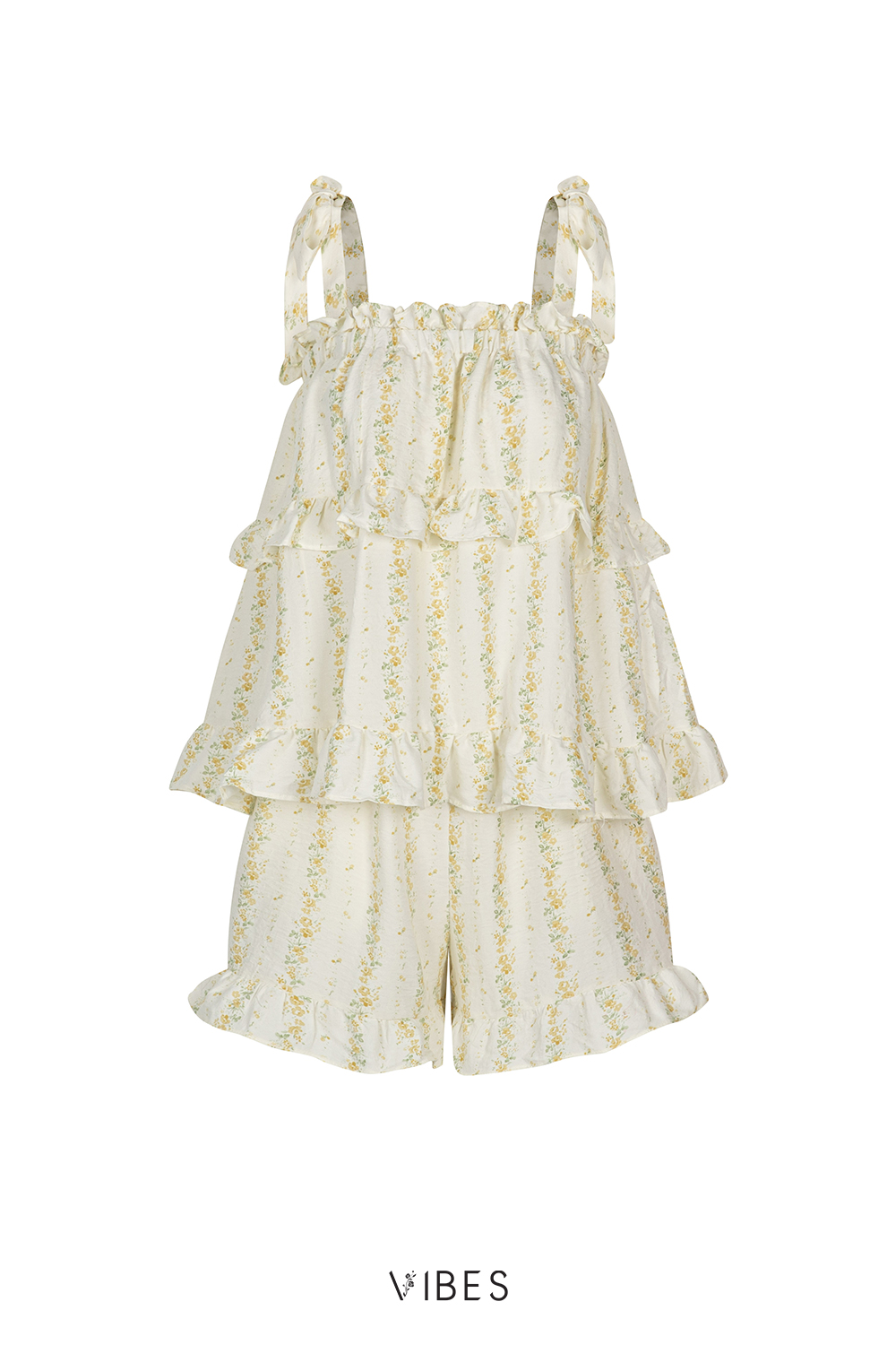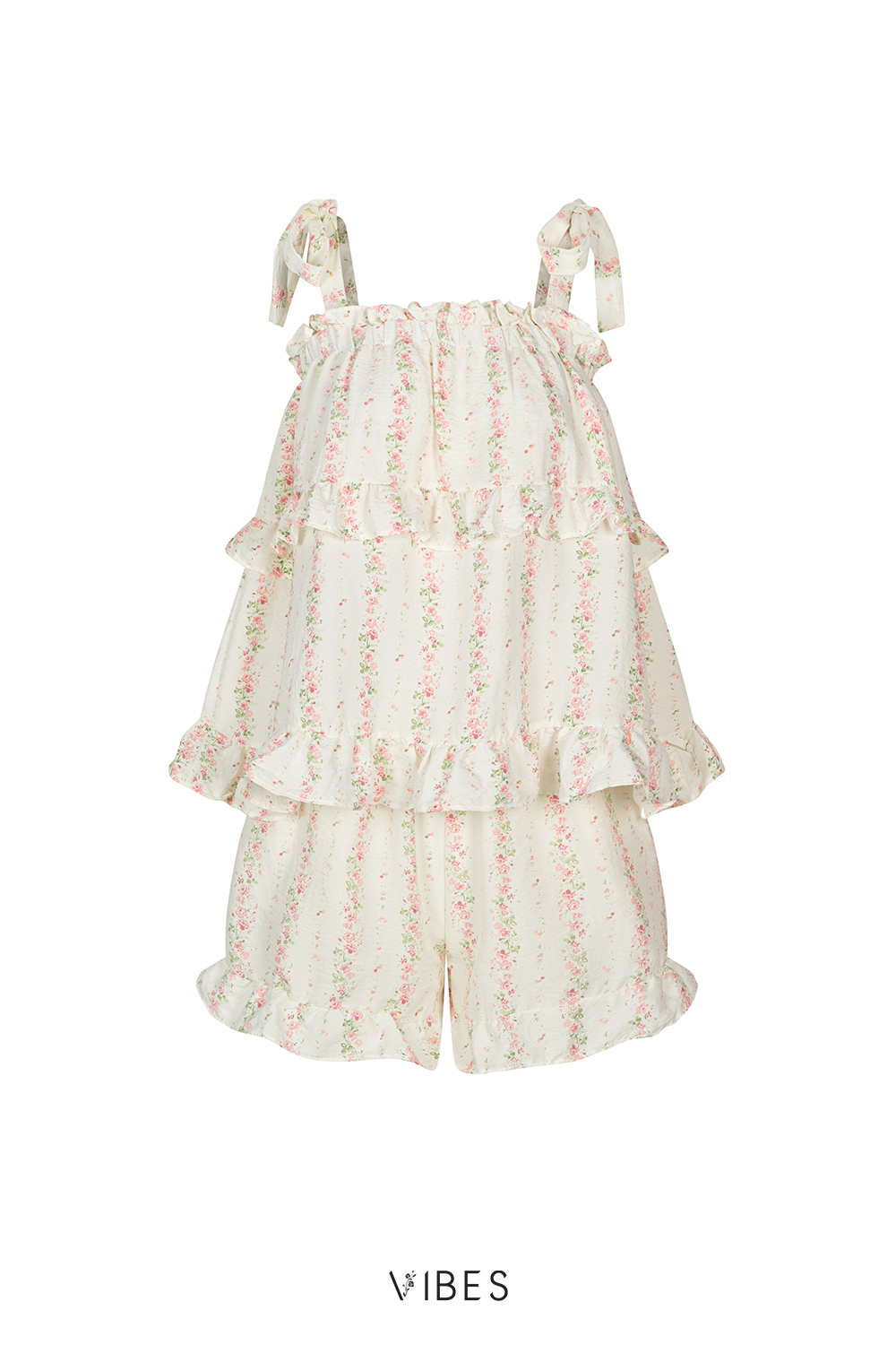 - Thiết kế áo viền bèo xinh xắn, kèm 2 dây rời thắt nơ. Phom rộng mặc thoải mái, quần có túi 2 bên tiện dụng.