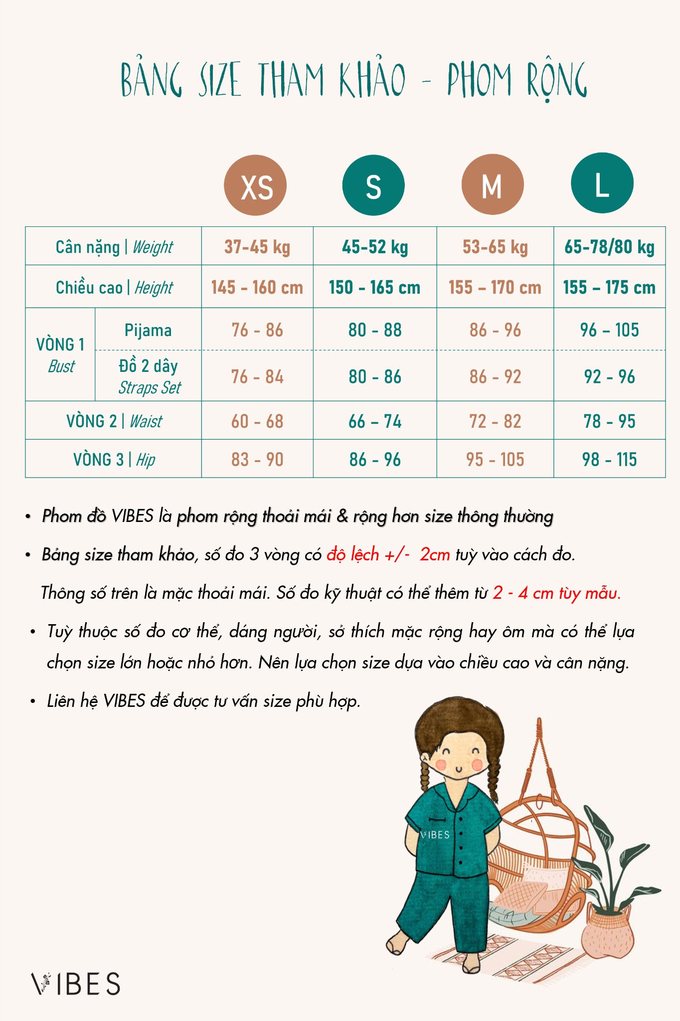 - Phom đồ tại VIBES là phom rộng, rộng hơn so với size thông thường, tùy vào chiều cao và cân nặng, số đo 3 vòng, phom người, sở thích mặc rộng hay vừa người để lựa chọn size. Vui lòng tham khảo kỹ bảng size hoặc liên hệ VIBES để được tư vấn.