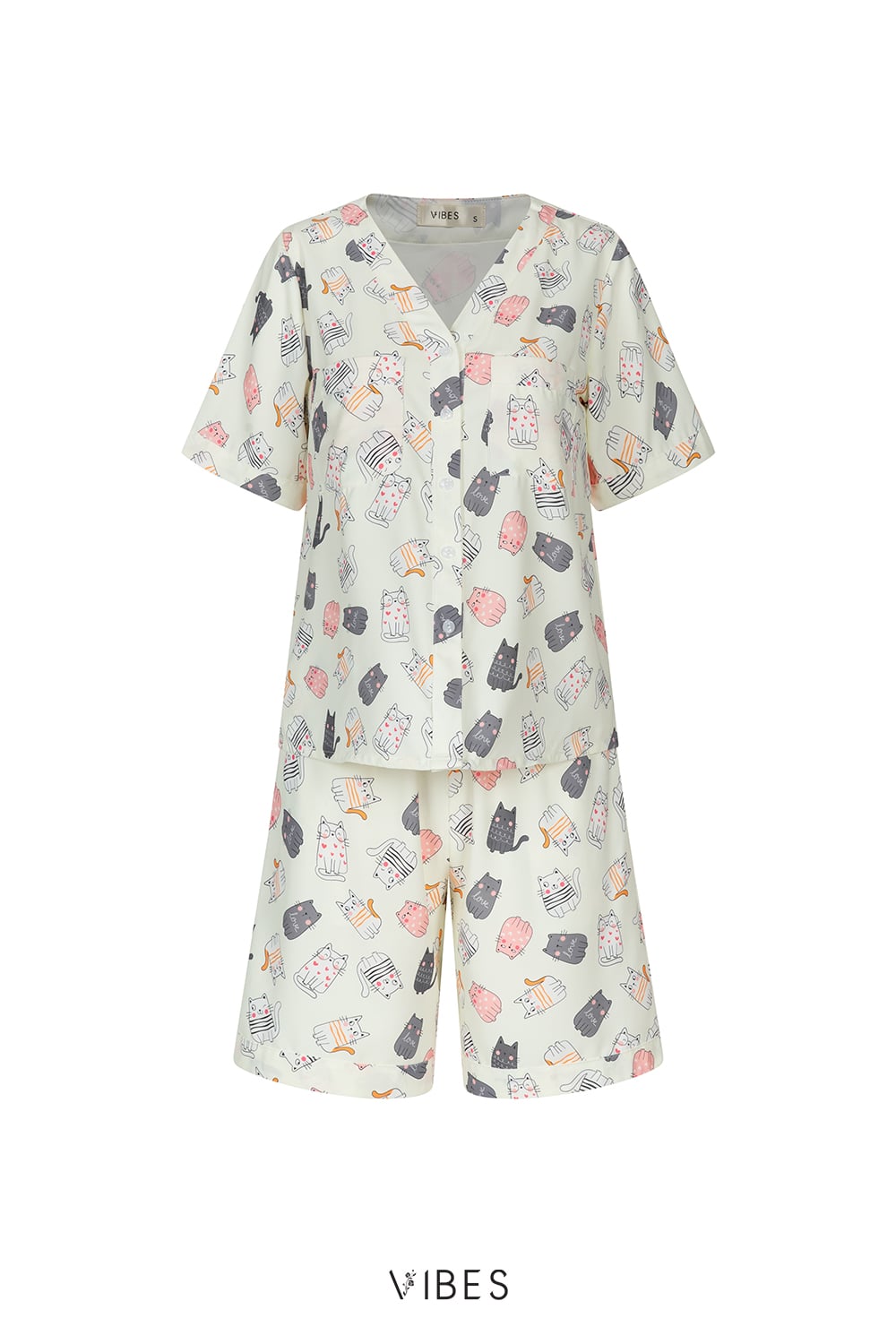 - Kiểu dáng pijama cổ V, thiết kế túi áo và túi quần tiện dụng, phom quần lửng đùi trên gối rộng thoải mái đứng lên ngồi xuống.